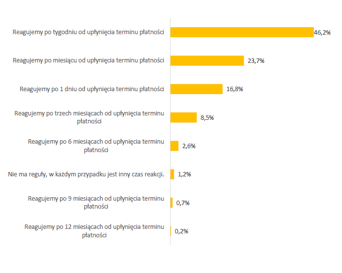 Najczęściej przedsiębiorcy reagują na brak zapłaty tydzień po zapadalności faktury. Deklaruje tak 46 proc. z nich. Prawie co 4. upomina się o pieniądze po miesiącu, ale 17 proc. monituje u kontrahentów już po jednym dniu opóźnienia.