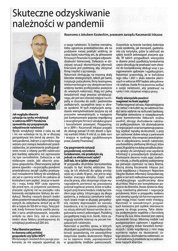 Rozmowa z Jakubem Kosteckim, prezesem Zarządu Kaczmarski Inkasso o tym jak skutecznie odzyskiwać należności w czasie pandemii (opublikowana 30 października 2020 r. w Gazecie Finansowej).